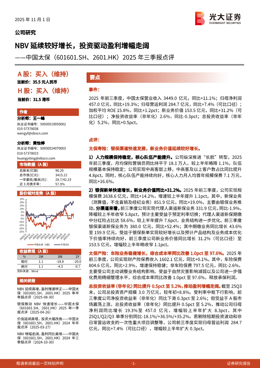 中国太保研报:光大证券-中国太保-601601-2025年三季报点评:NBV延续较好增长,投资驱动盈利增幅走阔-251101