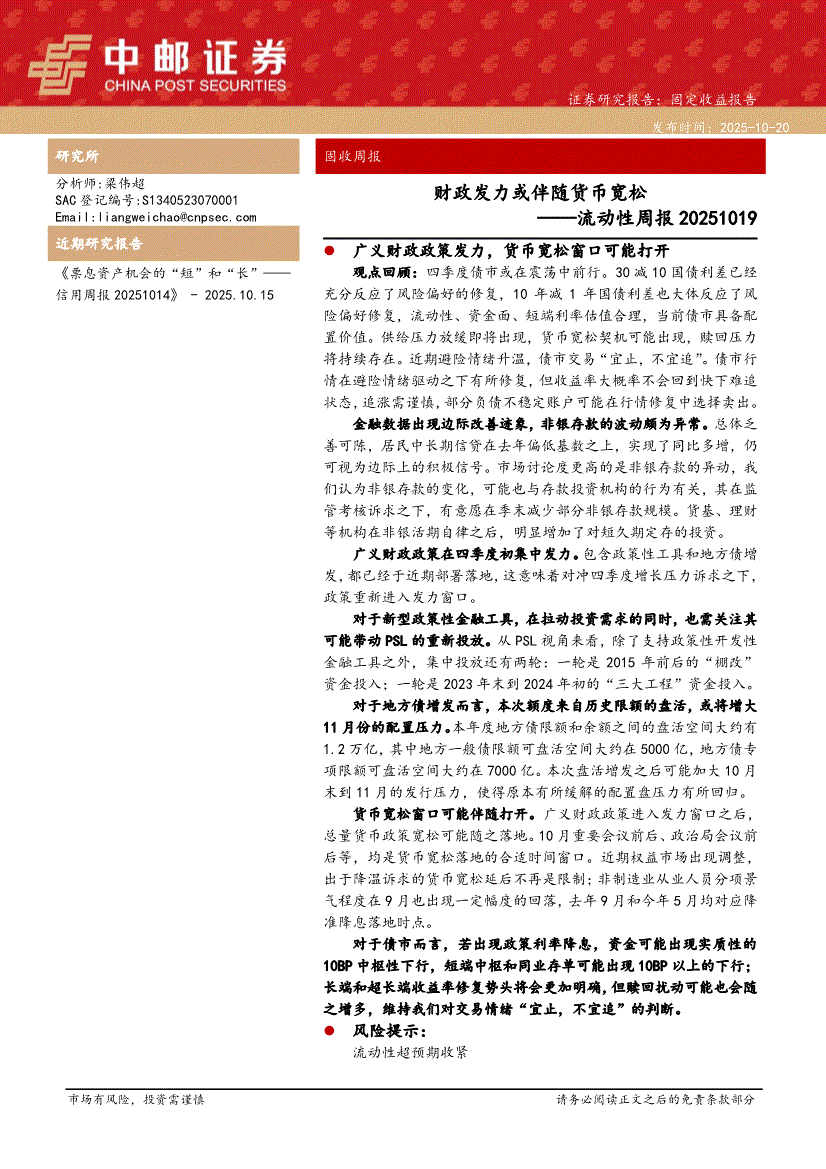 研报:中邮证券-流动性周报:财政发力或伴随货币宽松-251020