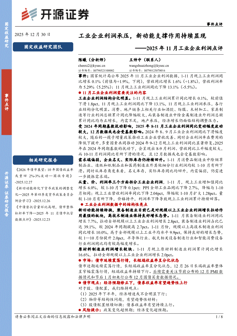 研报:开源证券-2025年11月工业企业利润点评:工业企业利润承压,新动能支撑作用持续显现-251230