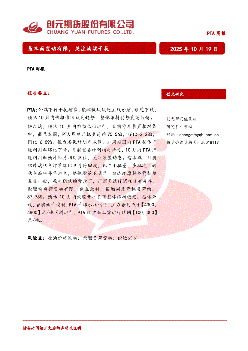 研报:创元期货-PTA周报:基本面变动有限,关注油端干扰-251019