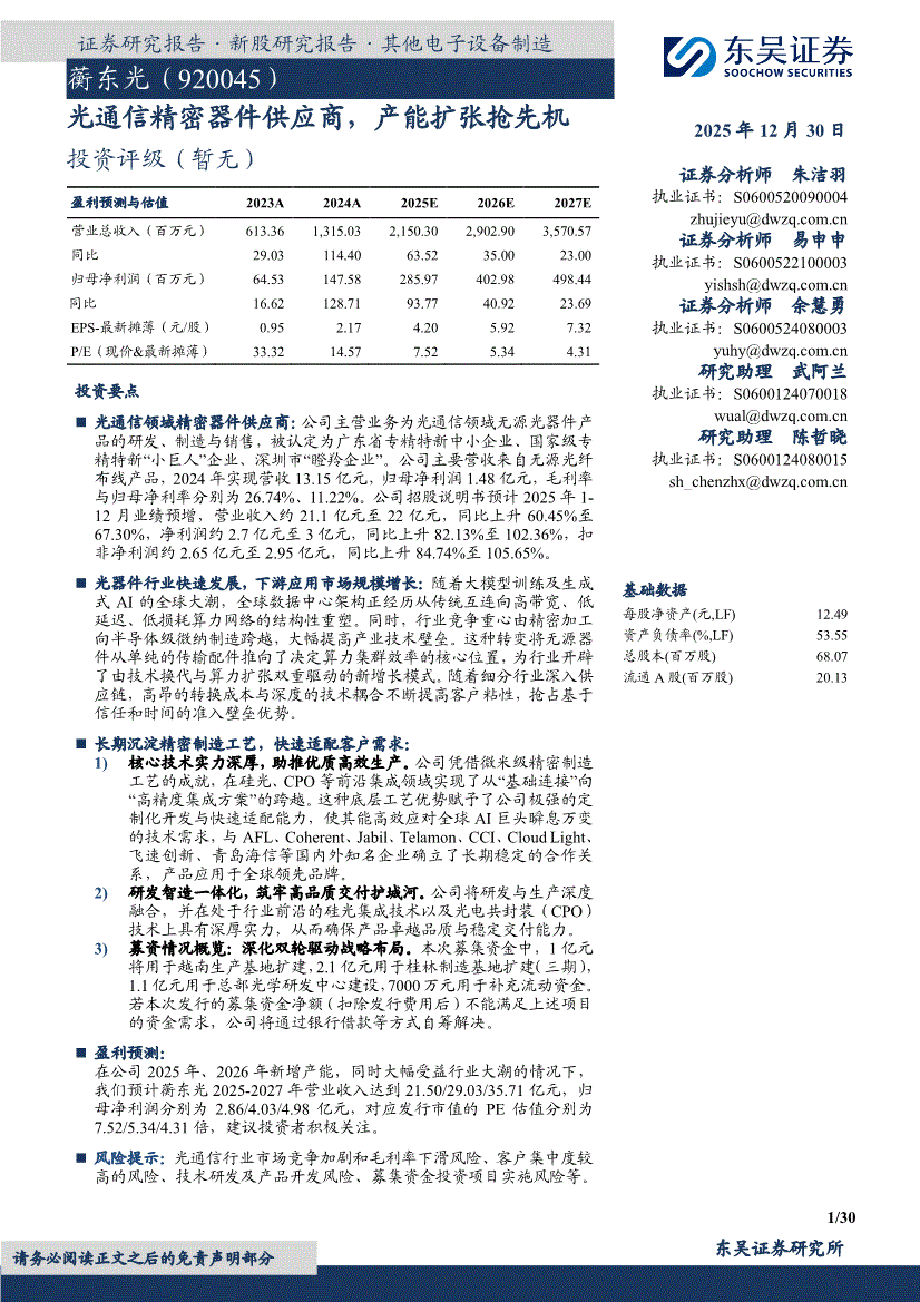 蘅东光研报:东吴证券-蘅东光-920045-光通信精密器件供应商,产能扩张抢先机-251230