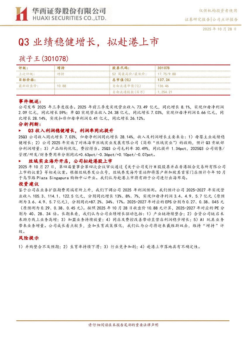 孩子王研报:华西证券-孩子王-301078-Q3业绩稳健增长,拟赴港上市-251028