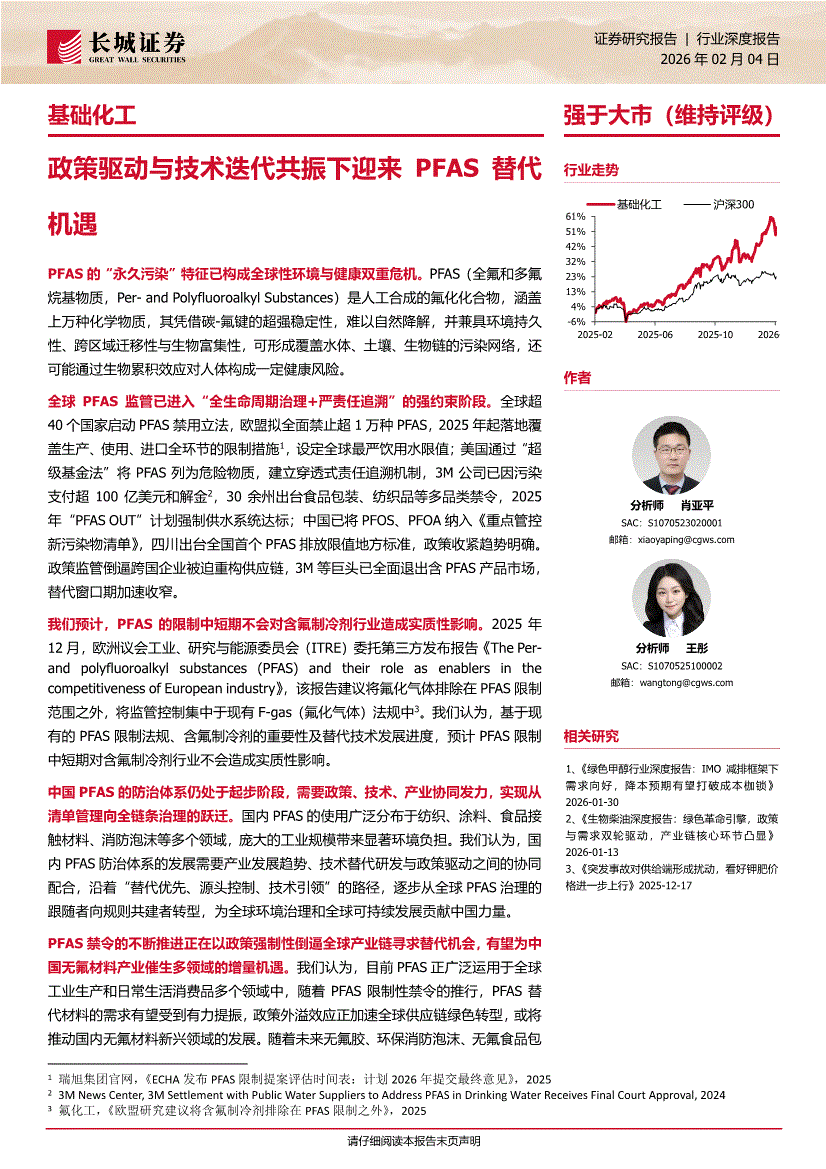 基础化工行业研报:长城证券-基础化工行业深度报告:政策驱动与技术迭代共振下迎来PFAS替代机遇-260204