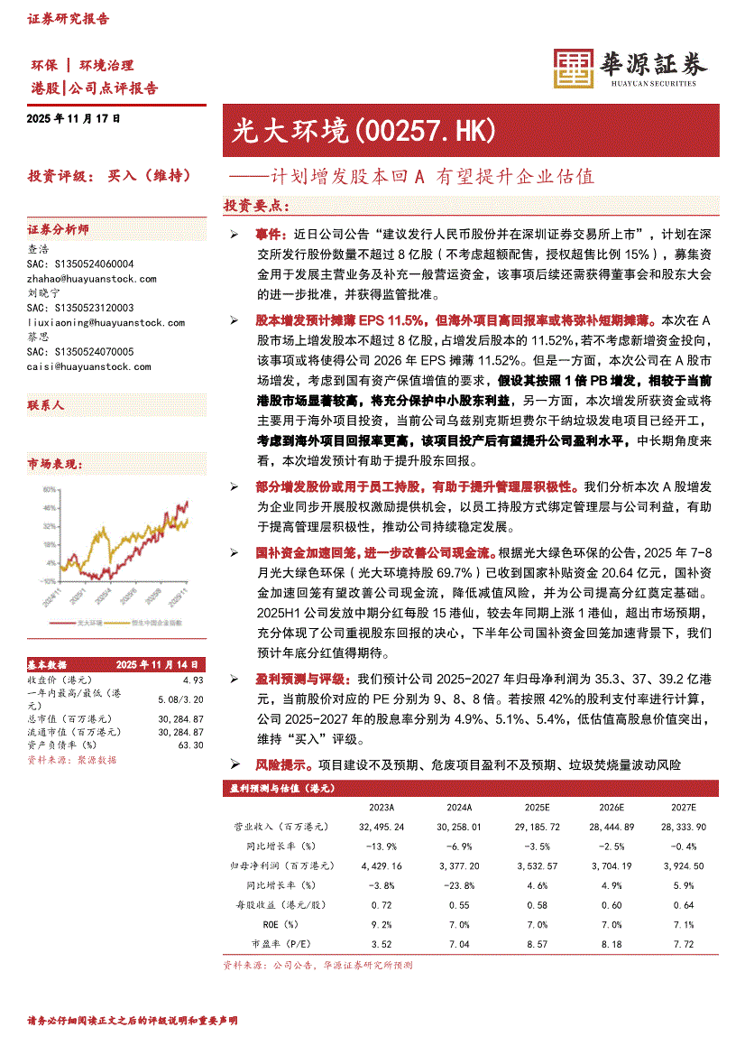 光大环境研报:华源证券-光大环境-0257.HK-计划增发股本回A,有望提升企业估值-251117