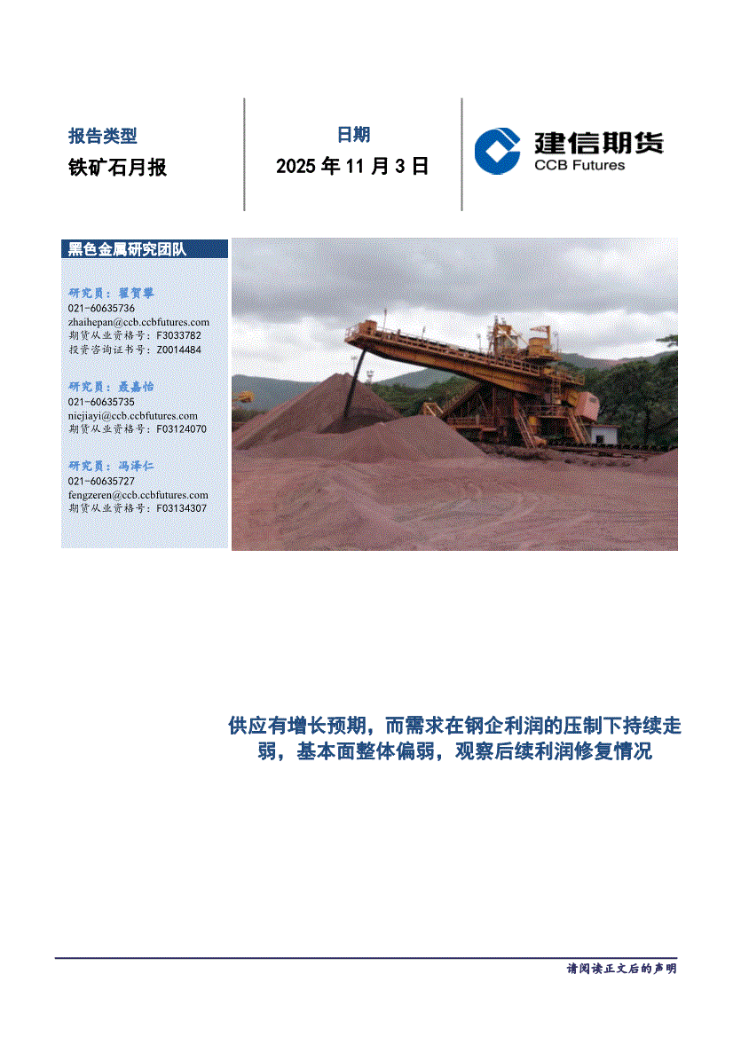 研报:建信期货-铁矿石月报:供应有增长预期,而需求在钢企利润的压制下持续走弱,基本面整体偏弱,观察后续利润修复情况-251103