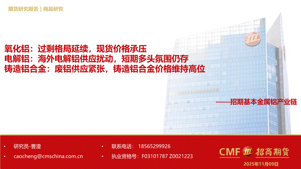 研报:招商期货-招期基本金属铝产业链:氧化铝,过剩格局延续,现货价格承压,电解铝,海外电解铝供应扰动,短期多头氛围仍存,铸造铝合金,废铝供应紧张,铸造铝合金价格维持高位-251109