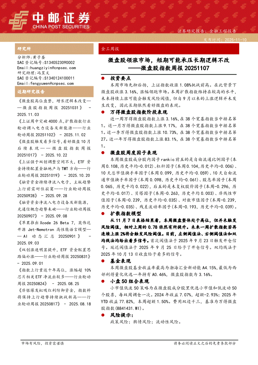 研报:中邮证券-微盘股指数周报:微盘股领涨市场,短期可能承压长期逻辑不改-251110