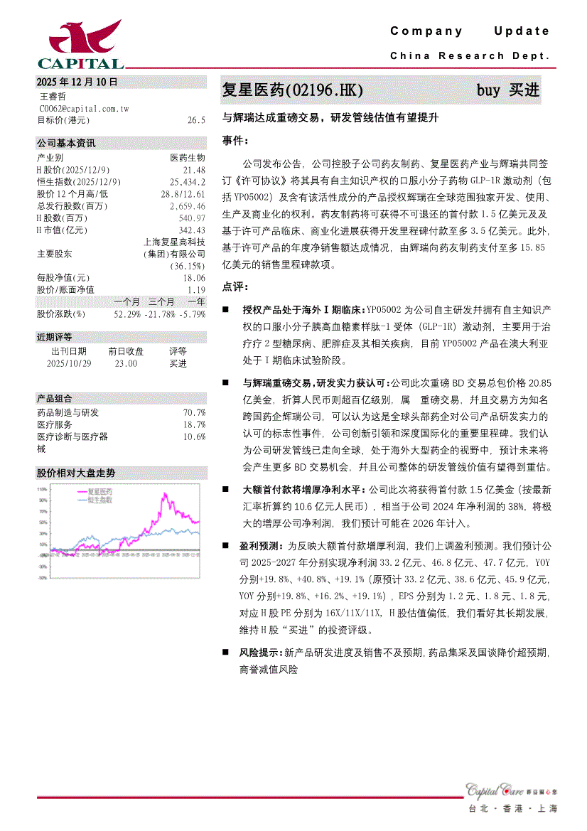 复星医药研报:群益证券(香港)-复星医药-2196.HK-与辉瑞达成重磅交易,研发管线估值有望提升-251210