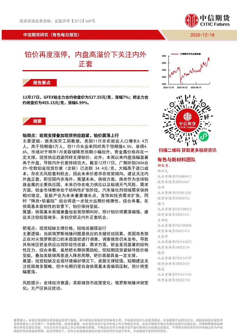 研报:中信期货-有色每日报告:铂价再度涨停,内盘高溢价下关注内外正套-251218
