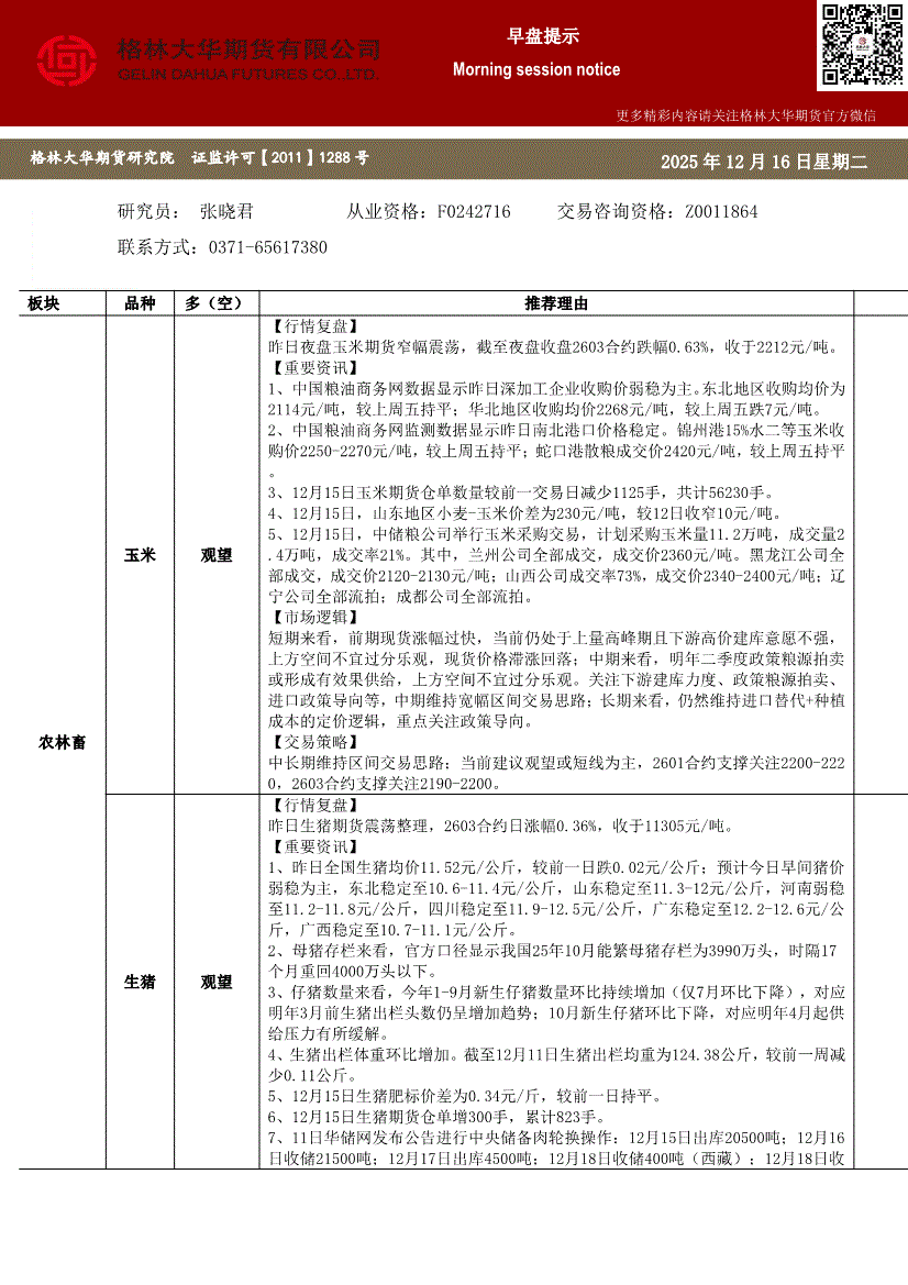 研报:格林大华期货-早盘提示:玉米生猪鸡蛋-251216