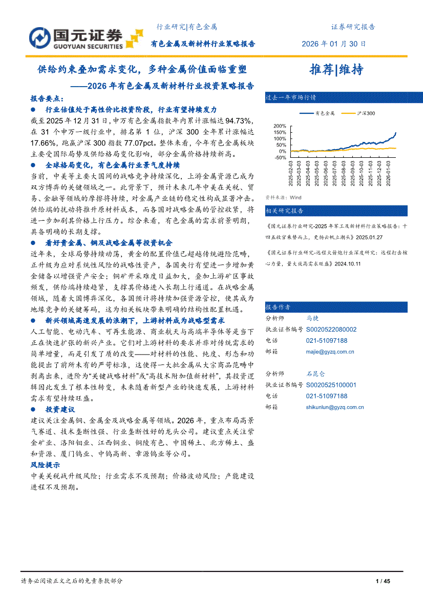 有色金属及新材料行业研报:国元证券-2026年有色金属及新材料行业投资策略报告:供给约束叠加需求变化,多种金属价值面临重塑-260130