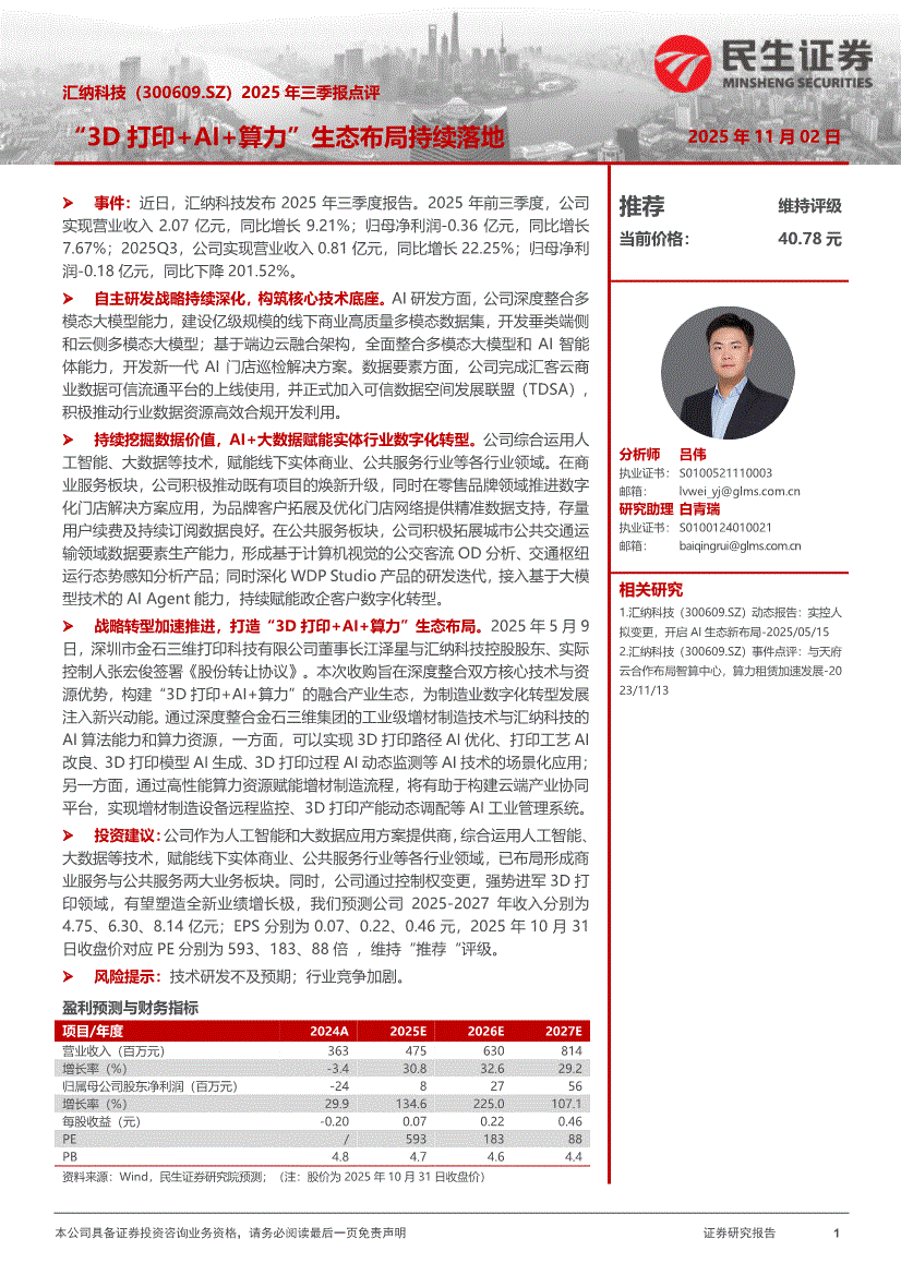 汇纳科技研报:民生证券-汇纳科技-300609-2025年三季报点评:“3D打印+AI+算力”生态布局持续落地-251102