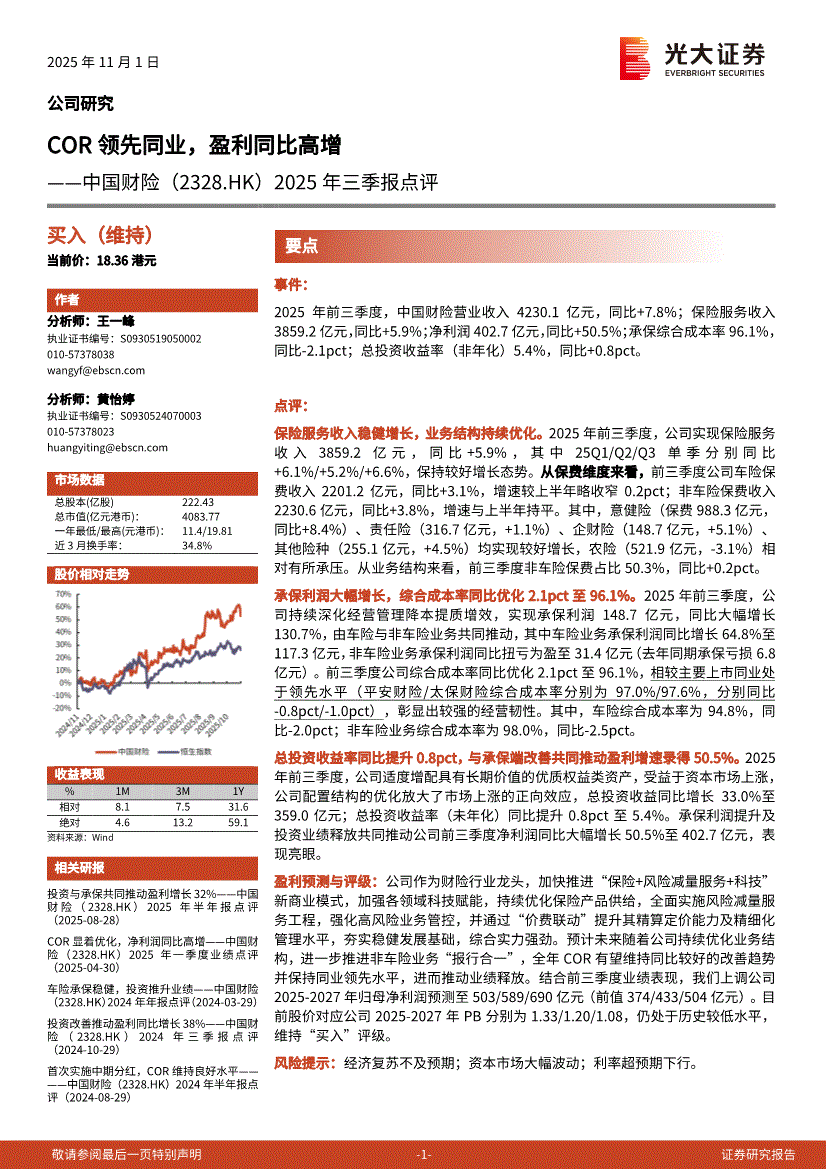 中国财险研报:光大证券-中国财险-2328.HK-2025年三季报点评:COR领先同业,盈利同比高增-251101