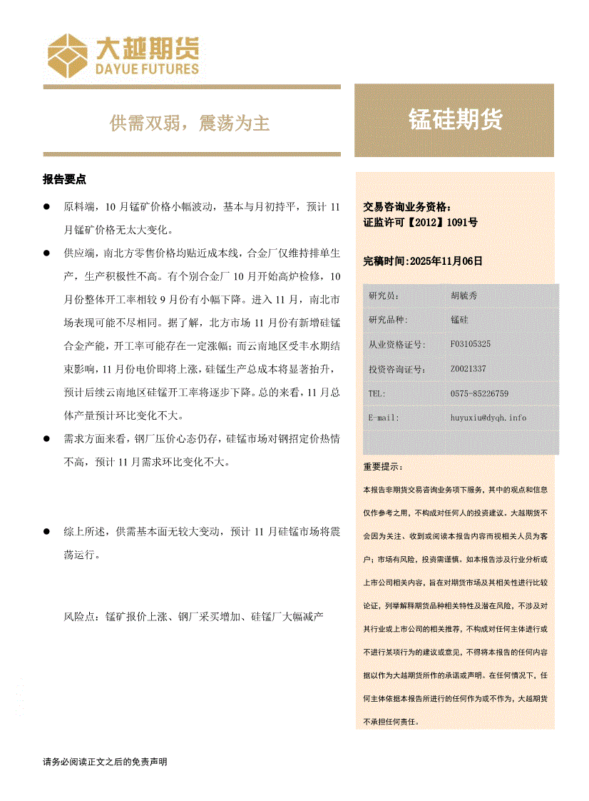 研报:大越期货-锰硅期货:供需双弱,震荡为主-251106