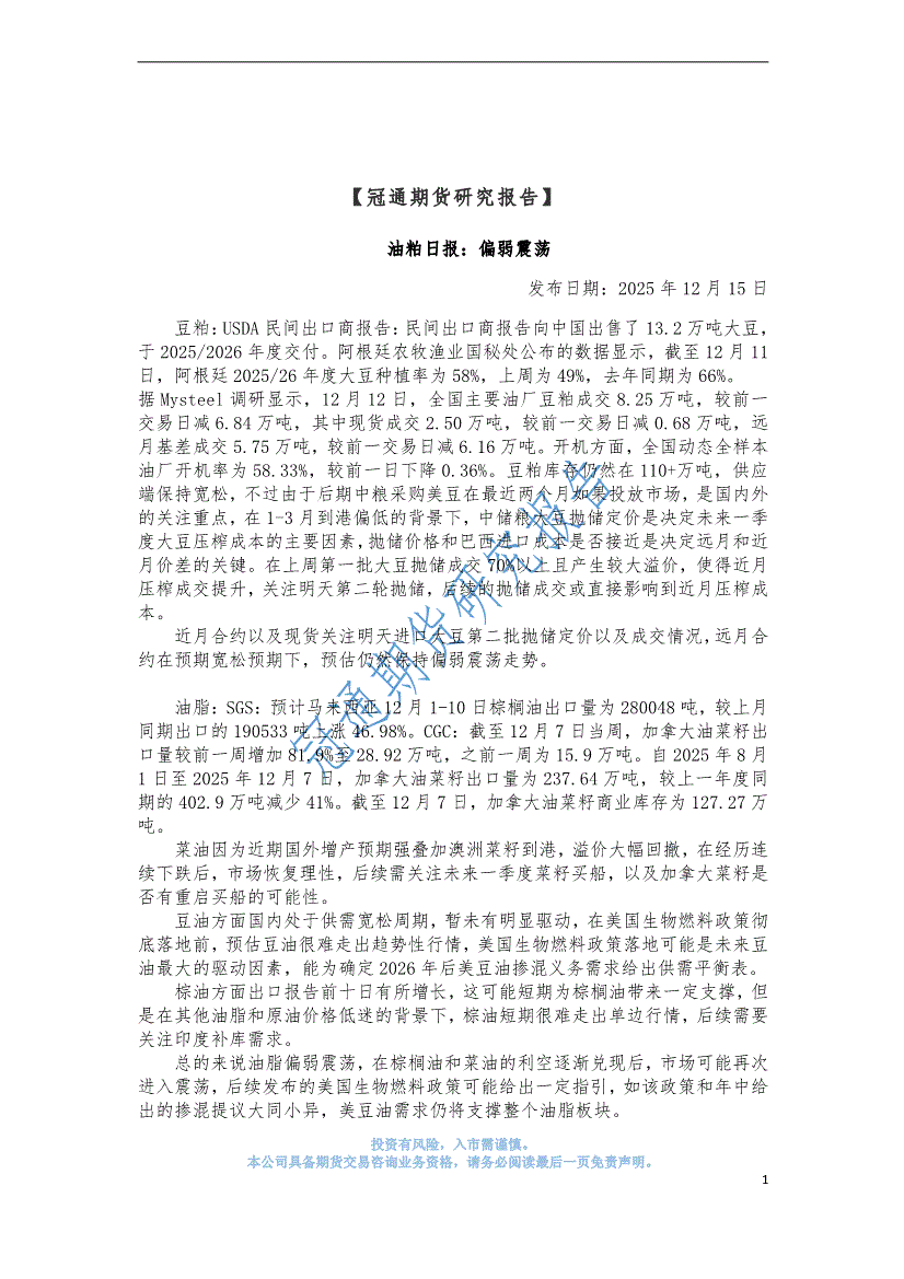 研报:冠通期货-油粕日报:偏弱震荡-251215