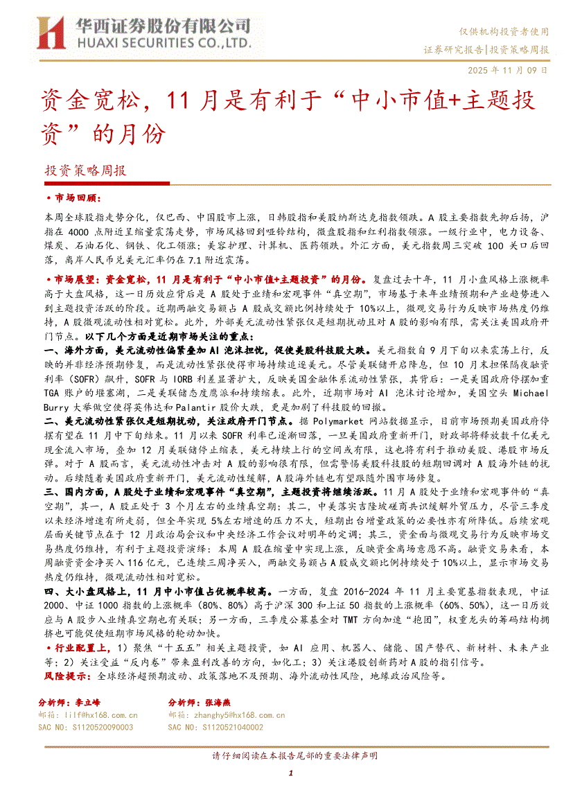 研报:华西证券-投资策略周报:资金宽松,11月是有利于“中小市值+主题投资”的月份-251109