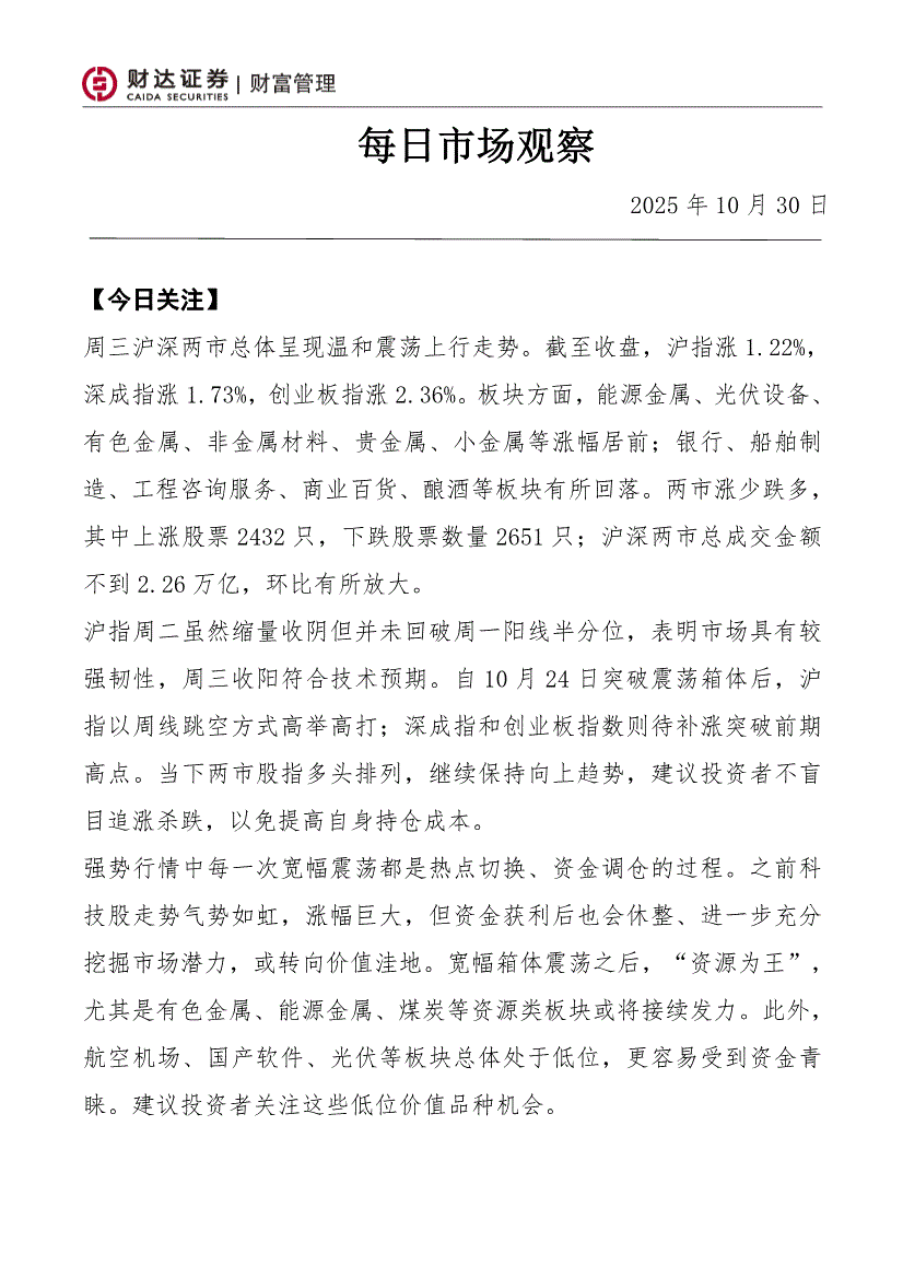 大同证券-市场日报:三大指数触底反弹,11月红盘开局-251103