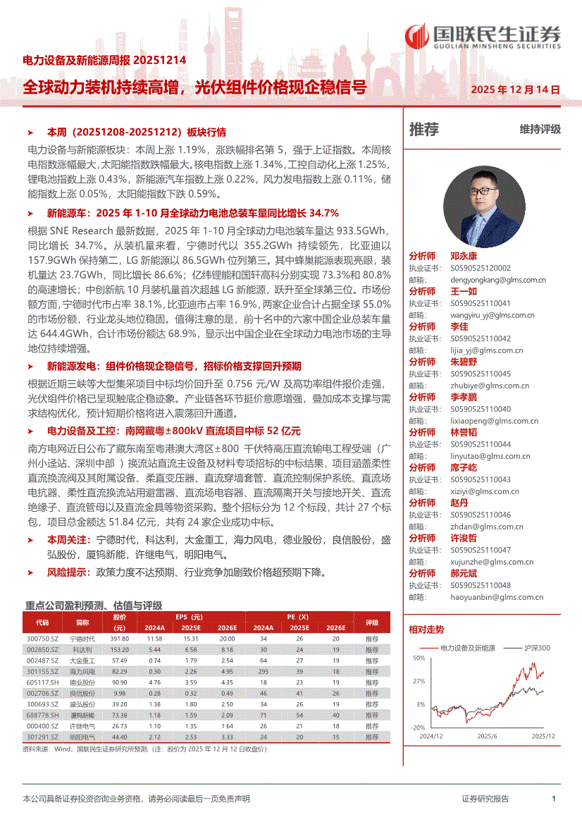 电力设备及新能源行业研报:国联民生证券-电力设备及新能源行业周报:全球动力装机持续高增,光伏组件价格现企稳信号-251214