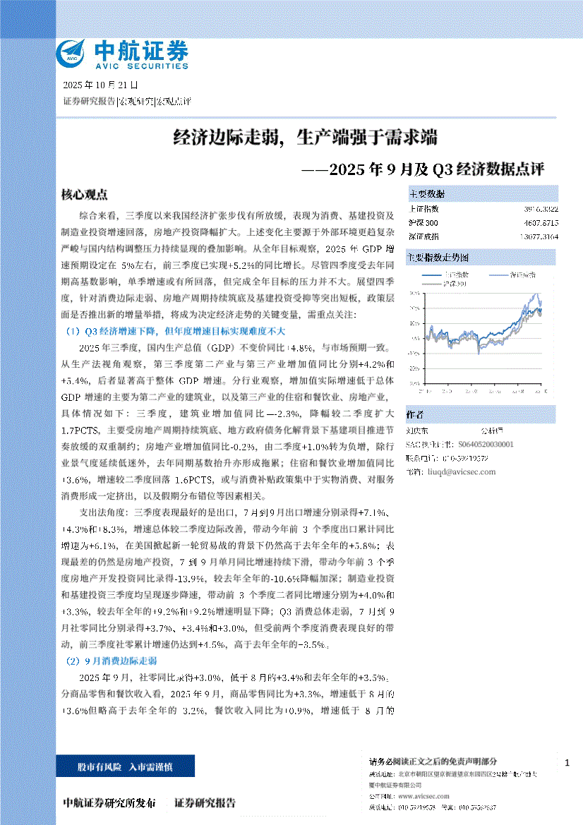 研报:中航证券-2025年9月及Q3经济数据点评:经济边际走弱,生产端强于需求端-251021