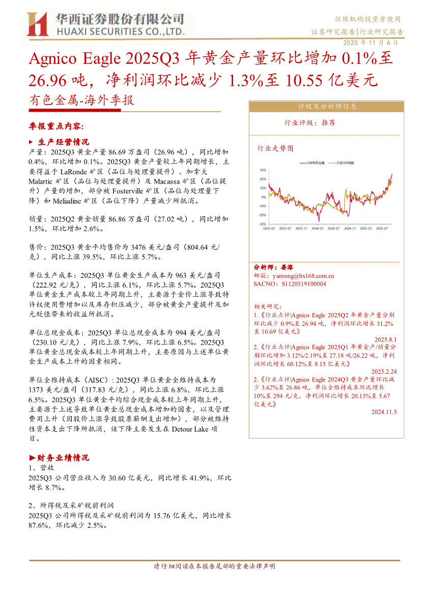 有色金属行业研报:华西证券-有色金属行业~海外季报:Agnico Eagle 2025Q3年黄金产量环比增加0.1%至26.96吨,净利润环比减少1.3%至10.55亿美元-251106