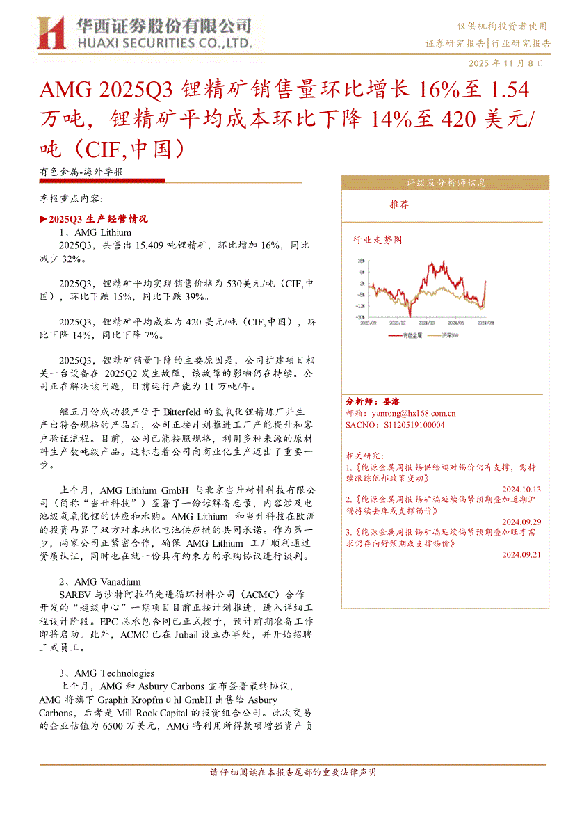 有色金属行业研报:华西证券-有色金属行业~海外季报:AMG 2025Q3锂精矿销售量环比增长16%至1.54万吨,锂精矿平均成本环比下降14%至420美元/吨(CIF,中国)-251108