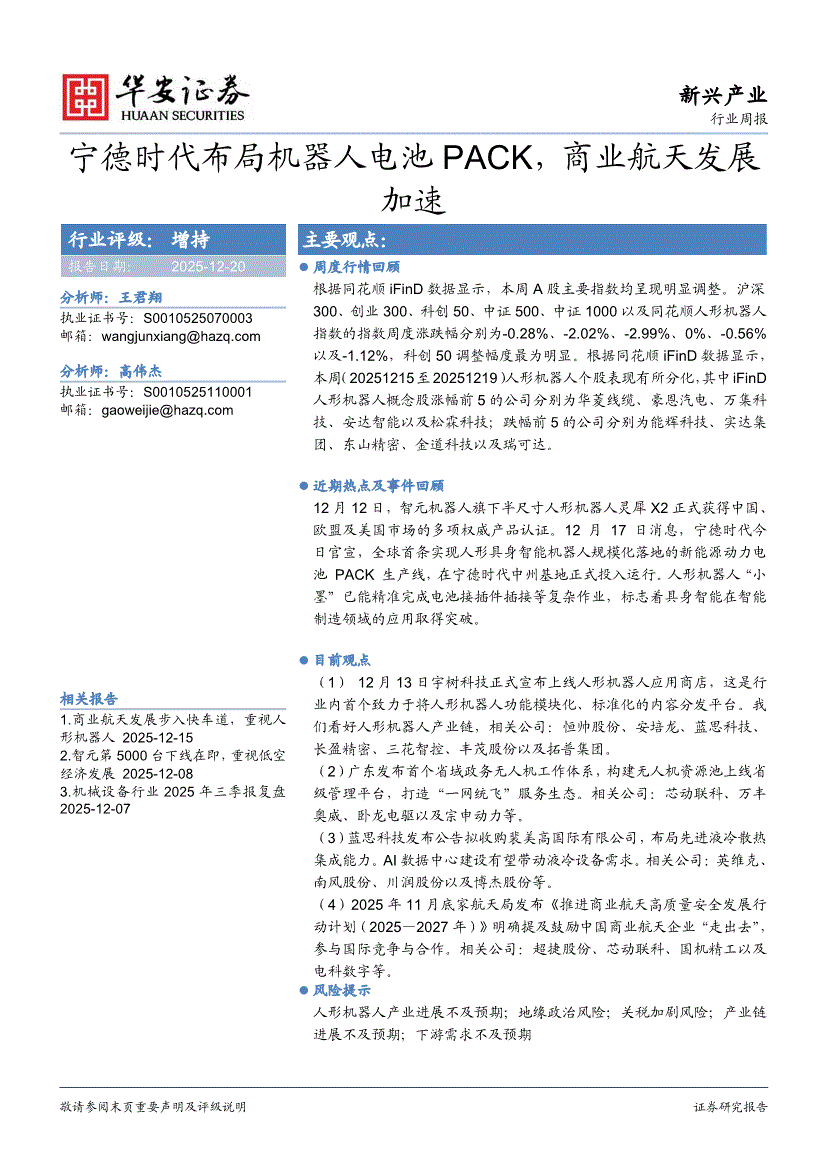 新兴产业行业研报:华安证券-新兴产业行业周报:宁德时代布局机器人电池PACK,商业航天发展加速-251220