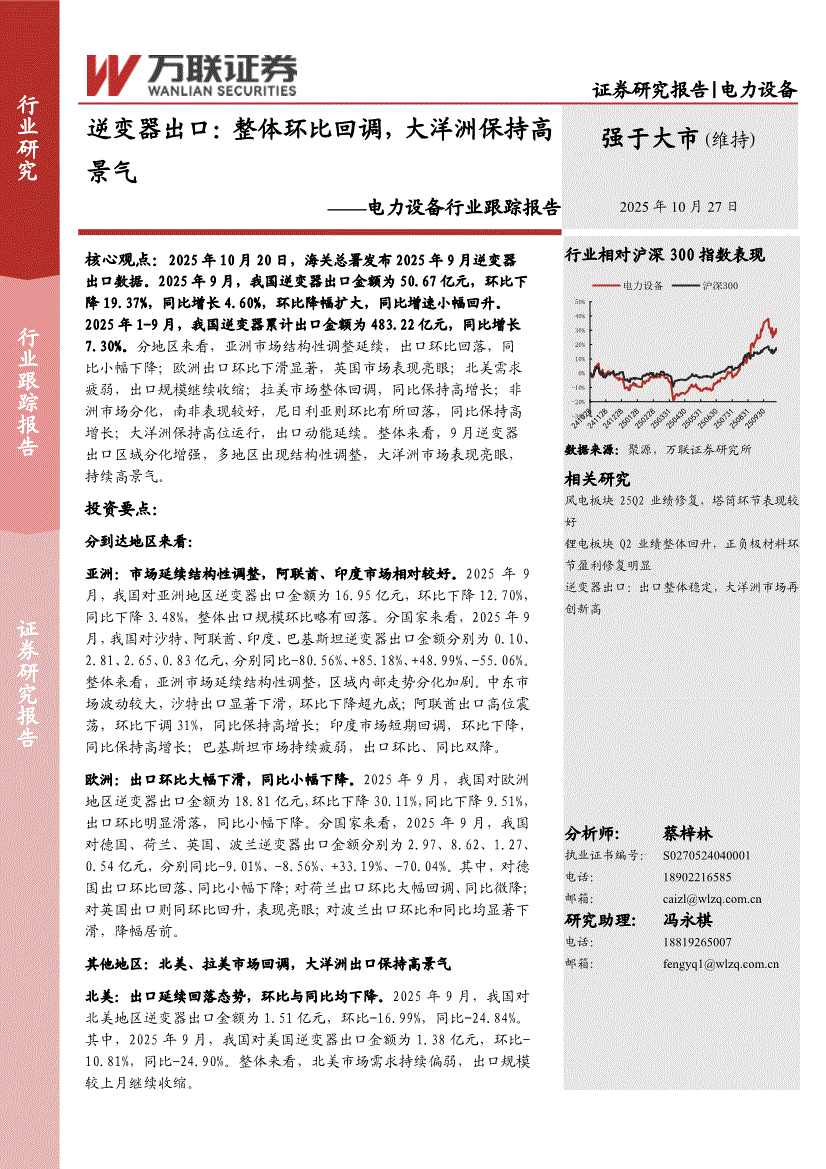电力设备行业研报:万联证券-电力设备行业跟踪报告:逆变器出口,整体环比回调,大洋洲保持高景气-251027