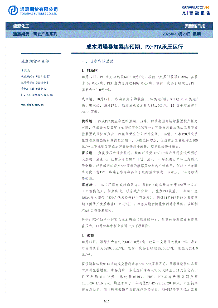 研报:通惠期货-聚酯链日报:成本坍塌叠加累库预期,PX~PTA承压运行-251020