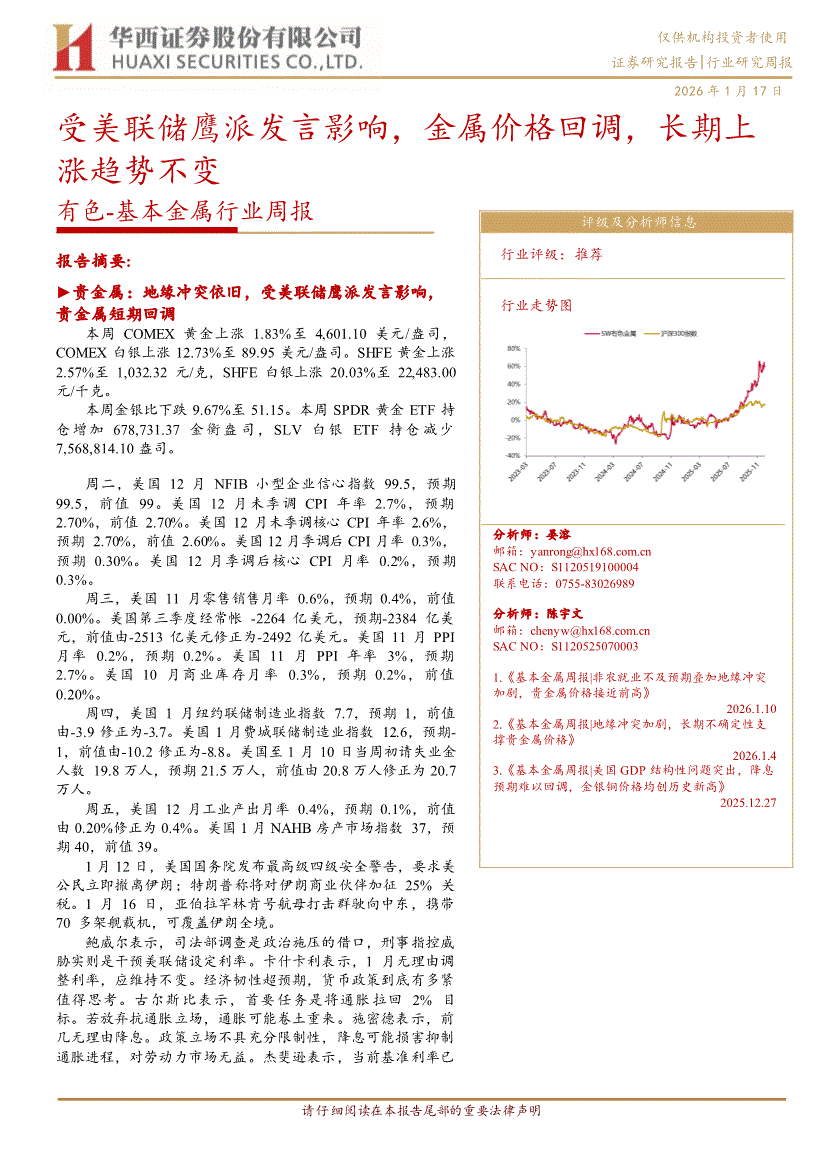 有色~基本金属行业研报:华西证券-有色~基本金属行业周报:受美联储鹰派发言影响,金属价格回调,长期上涨趋势不变-260117