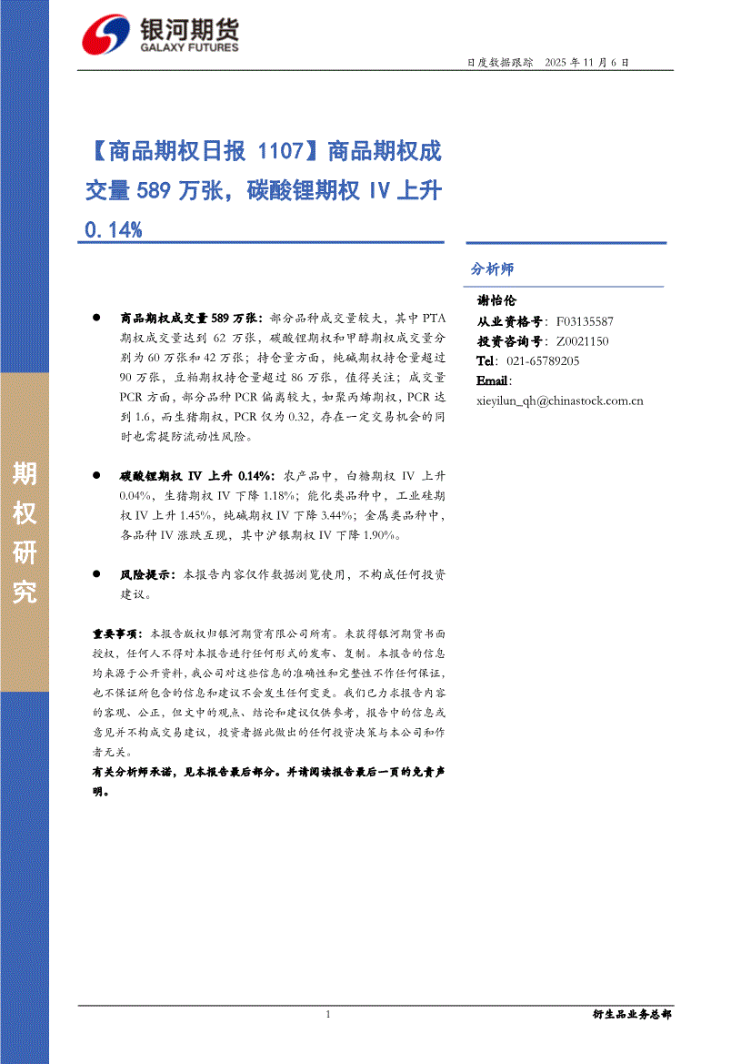 研报:银河期货-【商品期权日报1107】商品期权成交量589万张,碳酸锂期权IV上升0.14%-251106