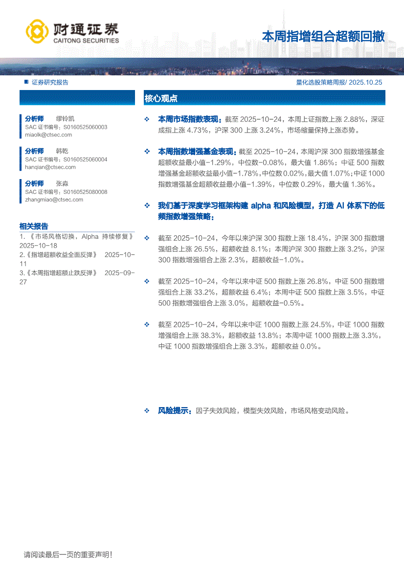 研报:财通证券-量化选股策略周报:本周指增组合超额回撤-251025