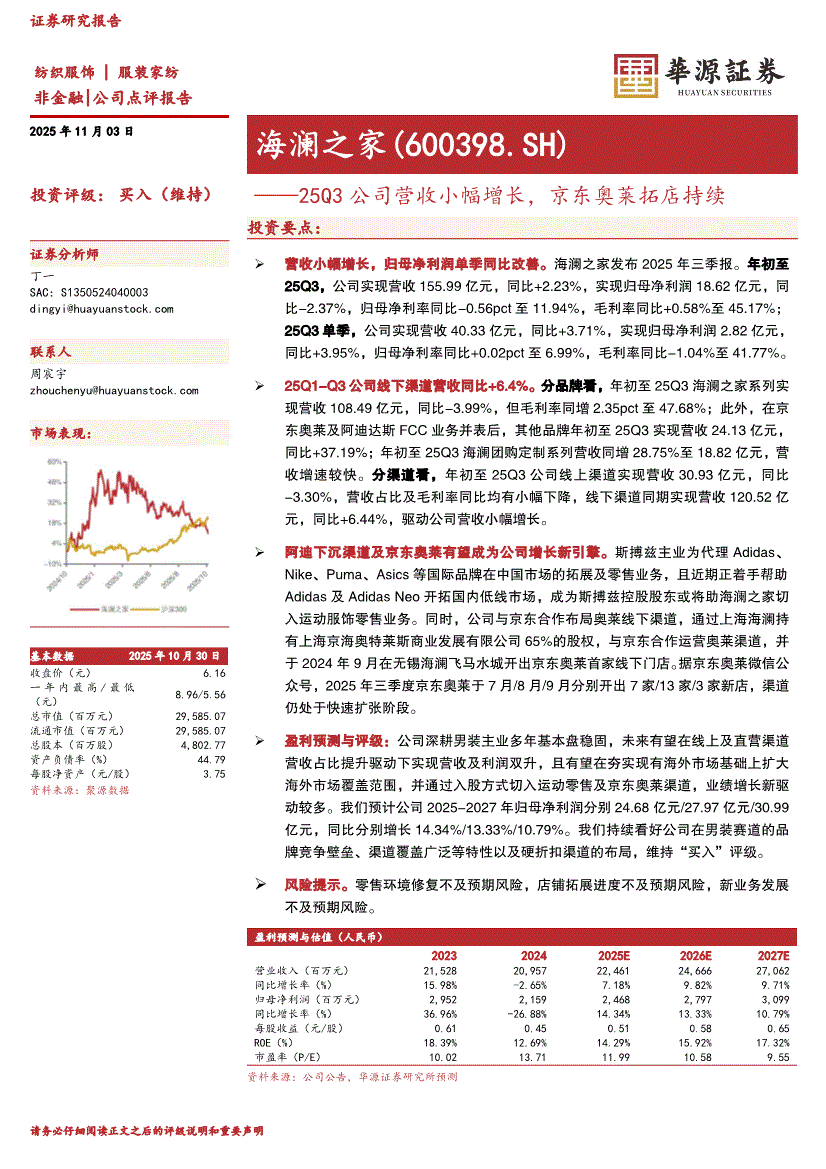 海澜之家研报:华源证券-海澜之家-600398-25Q3公司营收小幅增长,京东奥莱拓店持续-251103