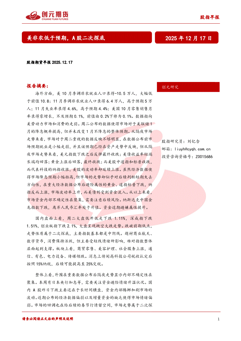 研报:创元期货-股指期货早报:美非农低于预期,A股二次探底-251217