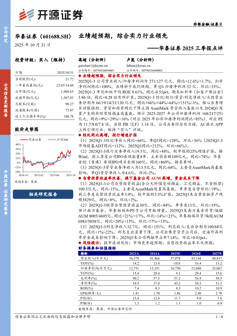 华泰证券研报:开源证券-华泰证券-601688-2025三季报点评:业绩超预期,综合实力行业领先-251031
