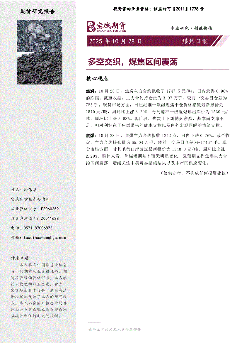 研报:宝城期货-煤焦日报:多空交织,煤焦区间震荡-251028