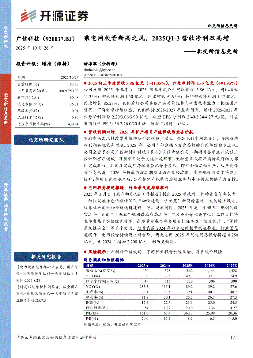 广信科技研报:开源证券-广信科技-920037-北交所信息更新:乘电网投资新高之风,2025Q1~3营收净利双高增-251026