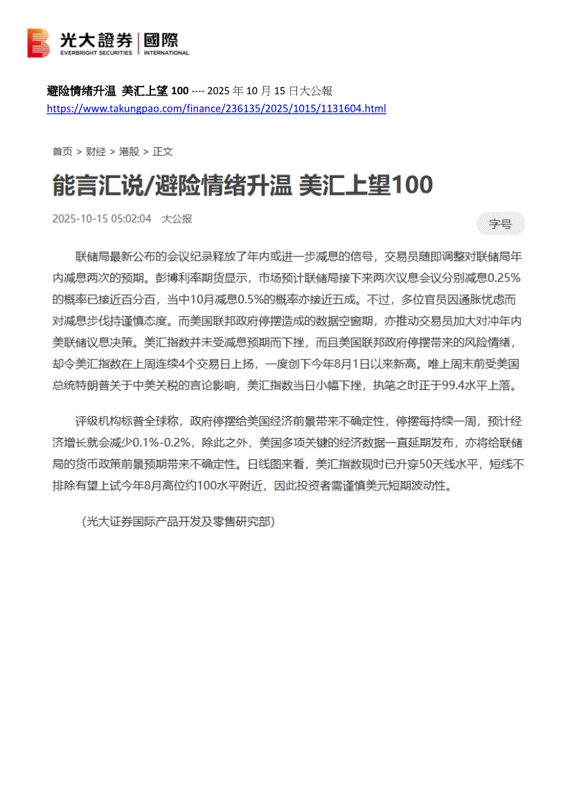 光大证券(国际)-能言汇说/避险情绪升温,美汇上望100-251015