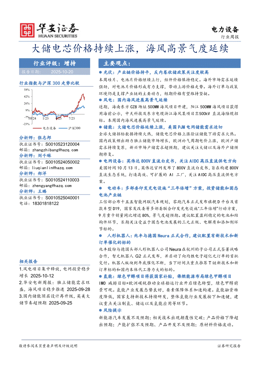 电力设备行业研报:华安证券-电力设备行业周报:大储电芯价格持续上涨,海风高景气度延续-251020