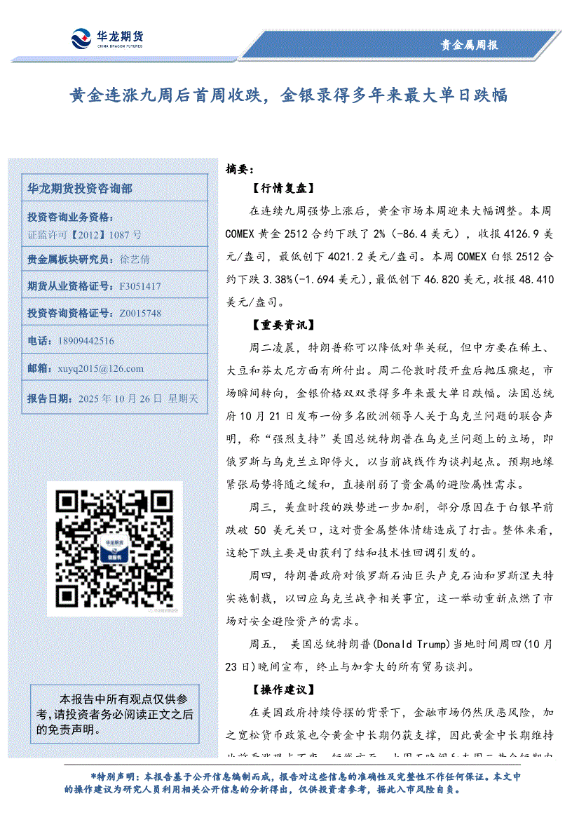 研报:华龙期货-贵金属周报:黄金连涨九周后首周收跌,金银录得多年来最大单日跌幅-251026