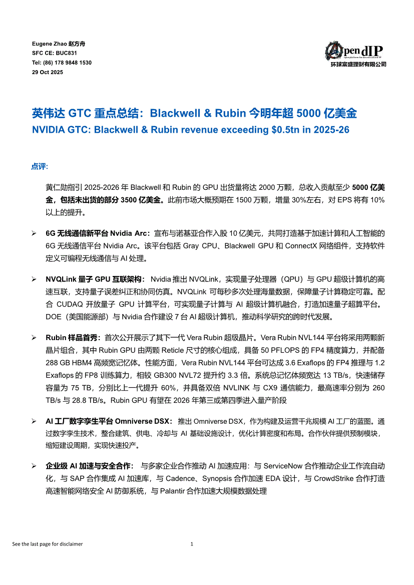 计算机行业研报:环球富盛-计算机行业英伟达GTC重点总结:Blackwell & Rubin今明年超5000亿美金-251029