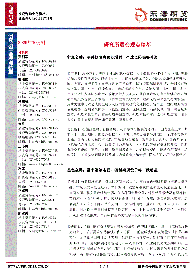研报:东海期货-研究所晨会观点精萃-251009