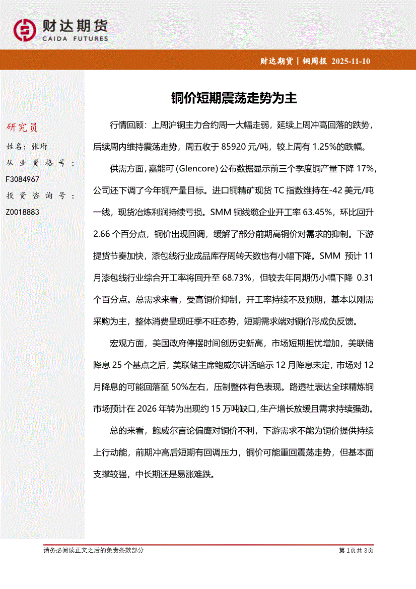 研报:财达期货-铜周报:铜价短期震荡走势为主-251110