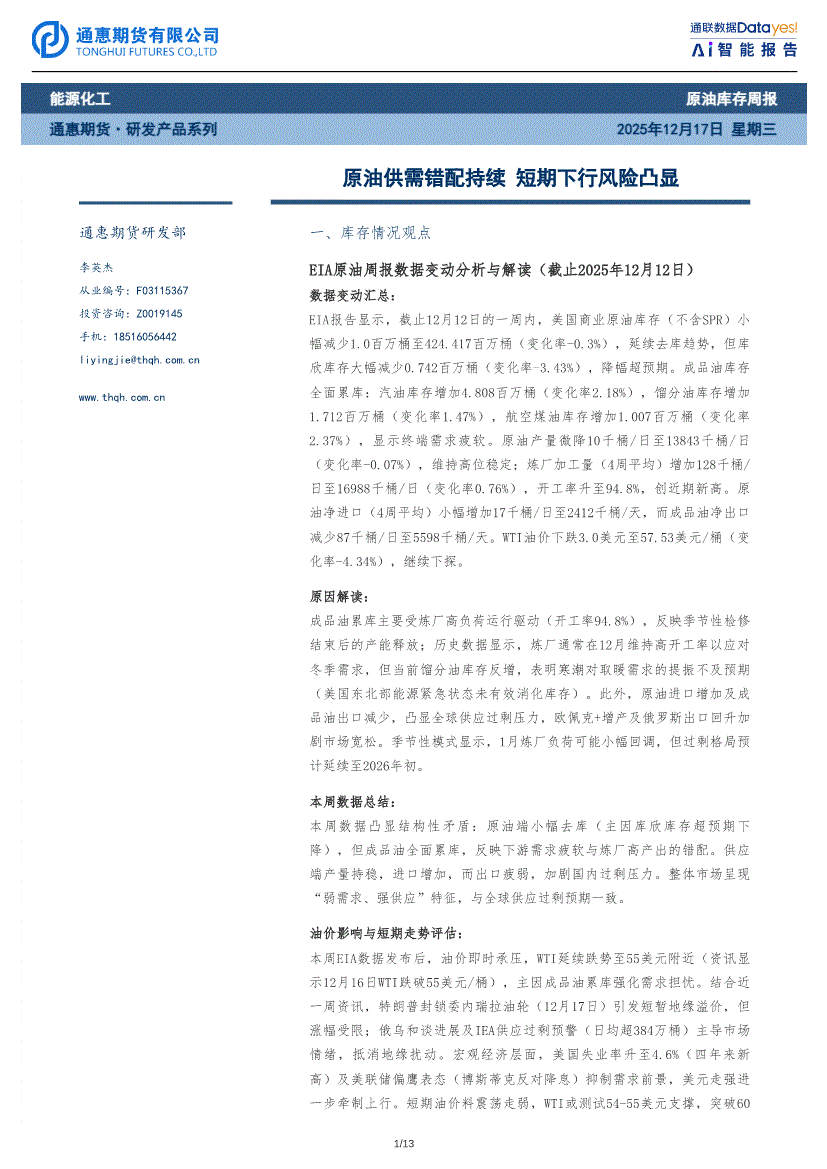 研报:通惠期货-原油库存周报:原油供需错配持续,短期下行风险凸显-251217