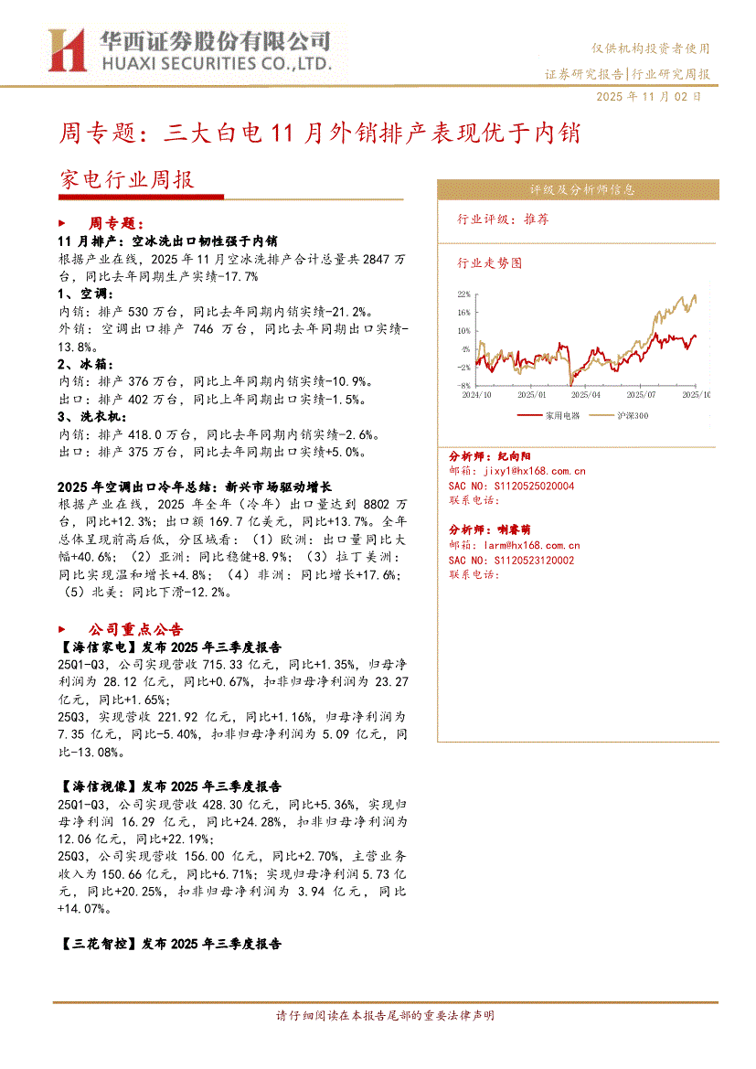 家电行业研报:华西证券-家电行业周报:周专题,三大白电11月外销排产表现优于内销-251102
