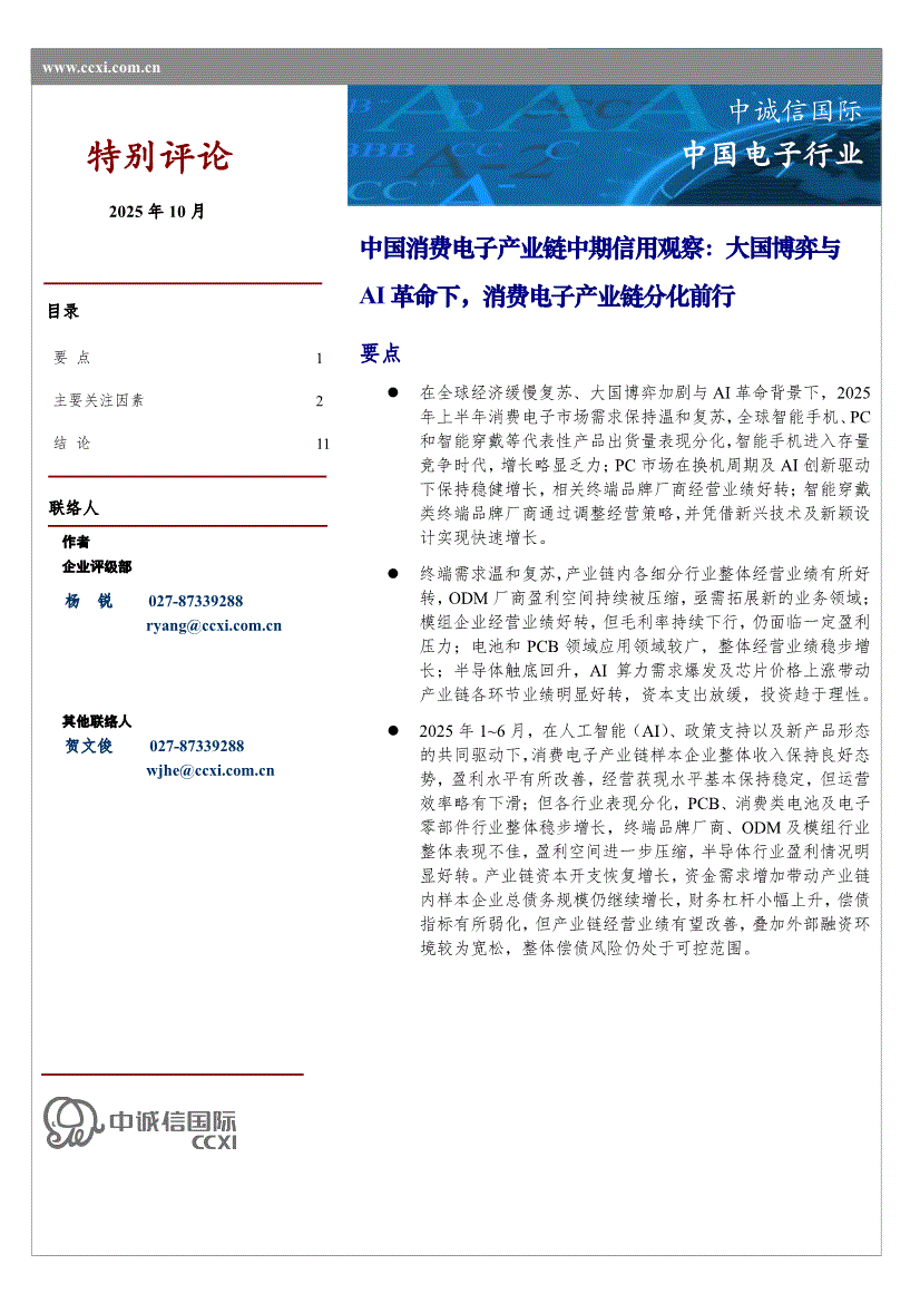 消费电子行业研报:中诚信国际-中国消费电子行业产业链中期信用观察:大国博弈与AI革命下,消费电子产业链分化前行-251013