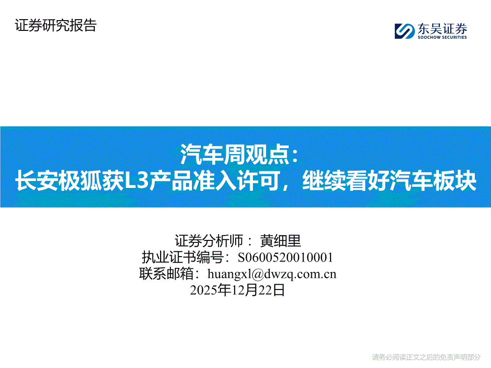 汽车行业研报:东吴证券-汽车行业周观点:长安极狐获L3产品准入许可,继续看好汽车板块-251222