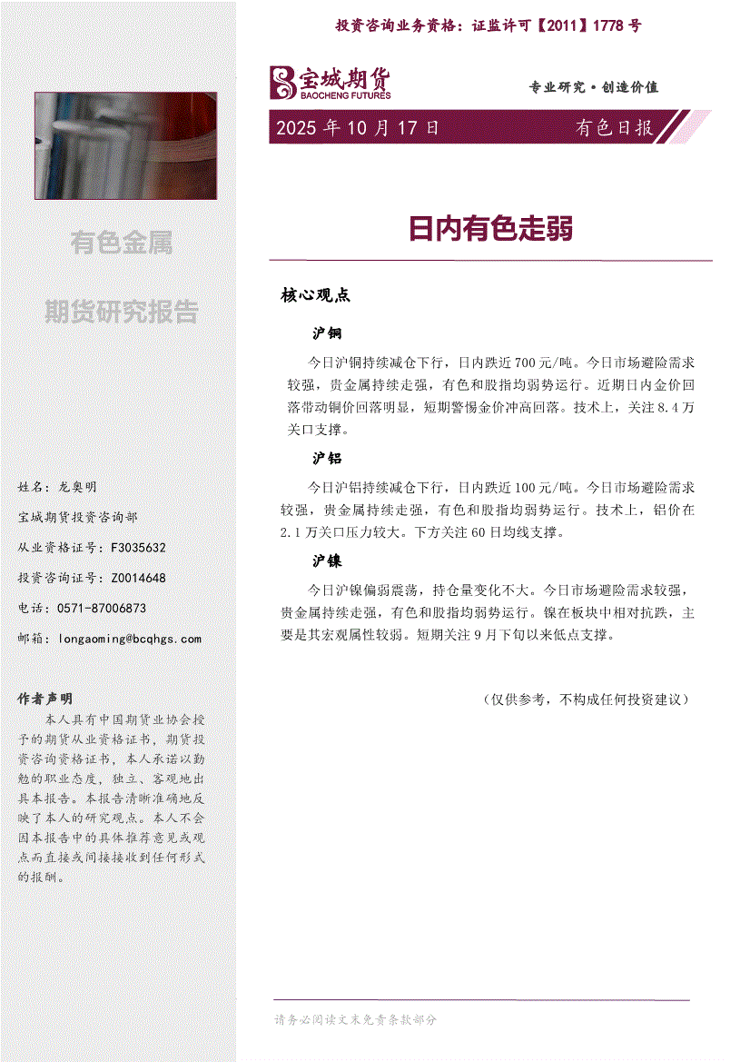 研报:宝城期货-有色日报:日内有色走弱-251017