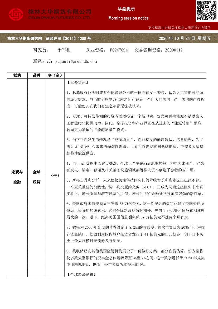 研报:格林大华期货-早盘提示:全球经济-251024