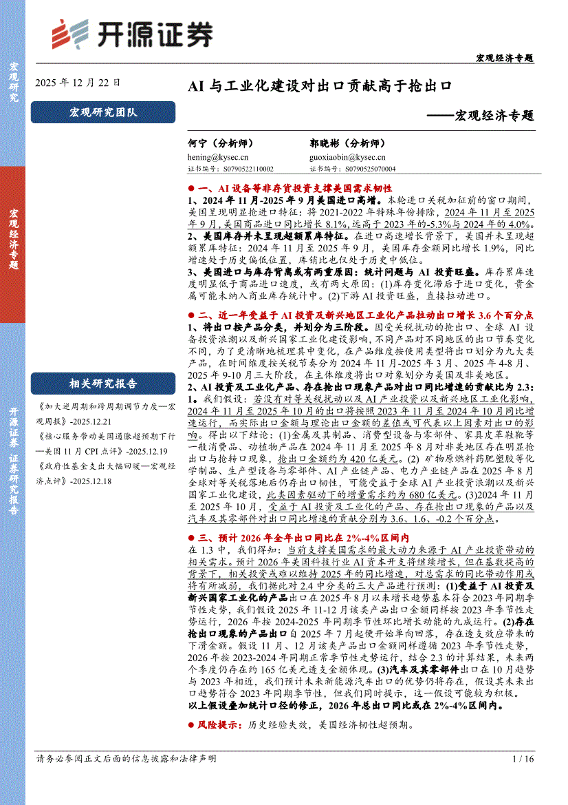 研报:开源证券-宏观经济专题:AI与工业化建设对出口贡献高于抢出口-251222