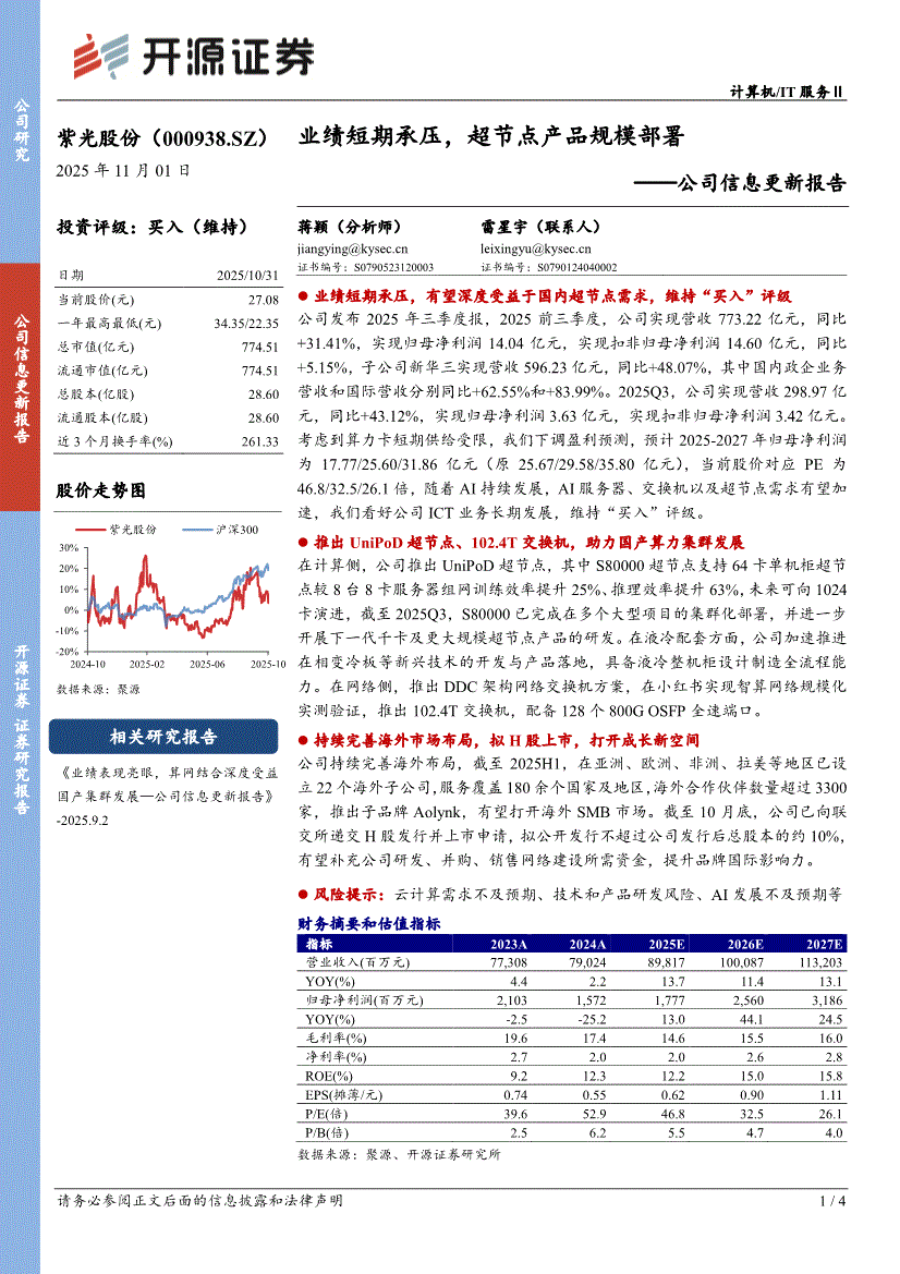 紫光股份研报:开源证券-紫光股份-000938-公司信息更新报告:业绩短期承压,超节点产品规模部署-251101
